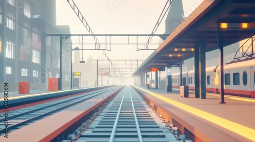 © Usman, Fototapeta premium Serene Urban Railway Station with Train Tracks and Modern Architectural Elements in Soft Morning Light