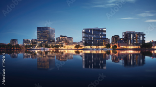© evening_tao, Obraz premium Serene Urban Waterfront at Twilight