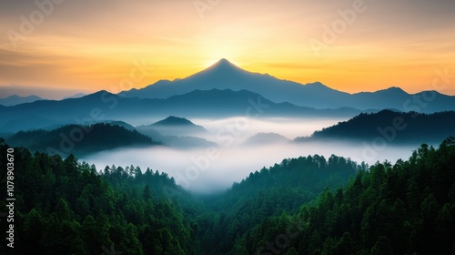 © Thanaphon, Obraz premium Serene Valley at Sunrise with Lush Misty Landscape