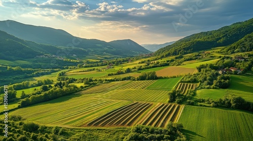 © nur, Fototapeta premium Serene Valley Landscape: Lush Green Fields and Rolling Hills