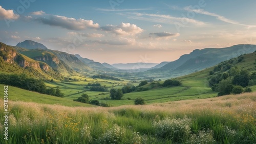 Fototapeta premium Serene Valley Landscape with Lush Greenery and Calm Sky Ideal for Nature...