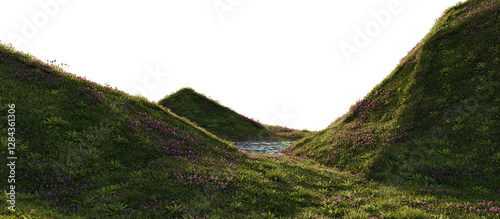 Fototapeta premium Serene Valley with Blooming Hills and Reflective Pond. 3D Rendering.