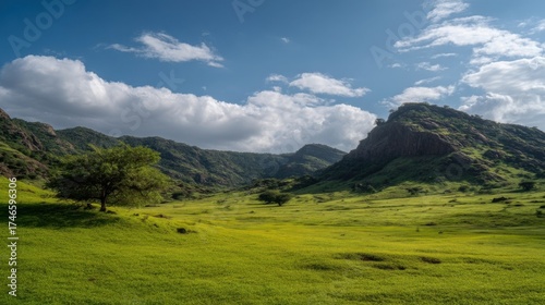 © LIS, Fototapeta premium Serene valley with rolling green hills, solitary tree, rocky formations under bright blue sky,