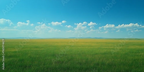 Fototapeta premium Serene vast grassland under a blue sky with fluffy clouds.
