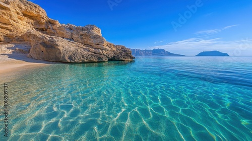 Fototapeta premium Serene view of a crystal-clear lagoon nestled among jagged cliffs, untouched...