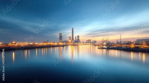 © Worakit, Naklejka premium serene view of city skyline at dusk, reflecting on calm waters, showcasing industrial structures and vibrant lights