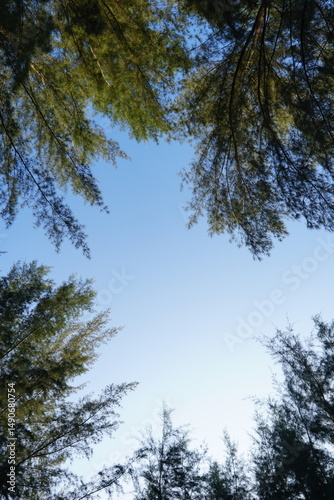 © Phurichai, Obraz premium Serene View of Clear Sky Framed by Lush Green Tree Tops in a Tranquil Nature Setting