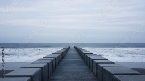 © AGCreative, Fototapeta premium serene view of concrete pathway leading to ocean, surrounded by gentle waves and cloudy sky. scene evokes sense of calm and tranquility