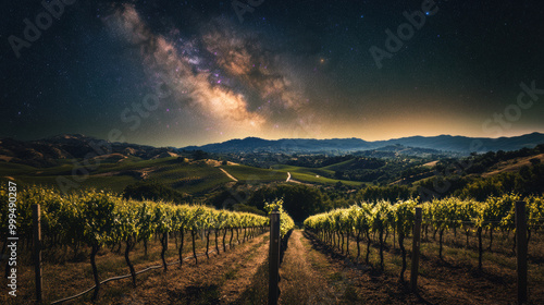 Fototapeta premium serene view of Milky Way over rolling hills and vineyards, creating...