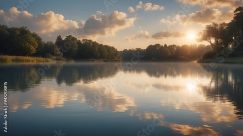 Fototapeta premium Serene view of water reflecting light and clouds.
