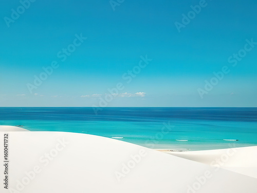 Obraz premium Serene view of white sand dunes meeting turquoise ocean under clear blue sky, evoking tranquility and natural beauty