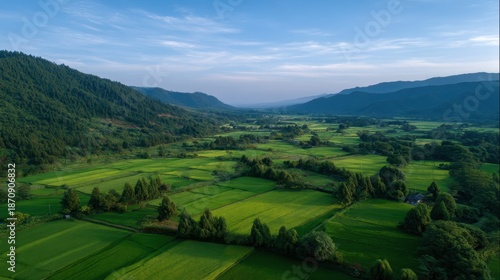 © Cozirlax, Obraz premium Serene View Over Patchwork Green Fields in a Vibrant Landscape