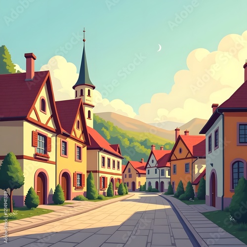 © Valerii, Naklejka premium Serene Village Sunrise in Vibrant Flat Style