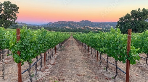 Obraz premium Serene Vineyard at Sunset Rows of Grapevines Against a Colorful Sky