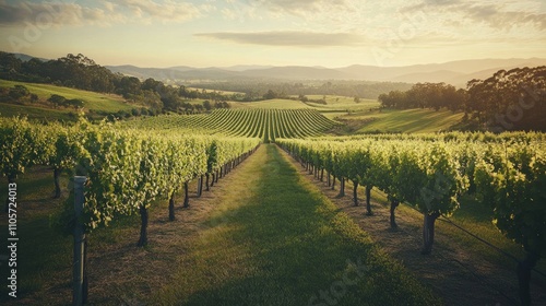 Fototapeta premium Serene Vineyard Landscape at Golden Hour with Lush Green Rows and Rolling...