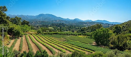 Fototapeta premium Serene Vineyard Landscape: Rows of Vines Against Majestic Mountains