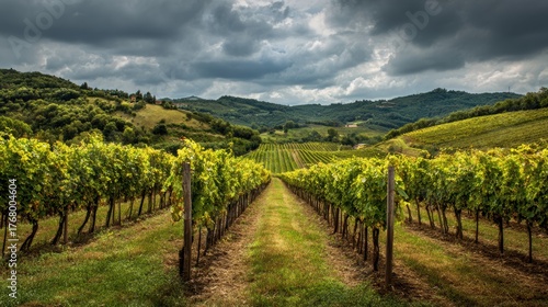 © paisorn, Naklejka premium Serene Vineyard Landscape Under Cloudy Sky in Rolling Hills