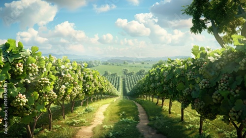 © Thinnawat, Fototapeta premium Serene Vineyard Landscape with Clear Blue Sky