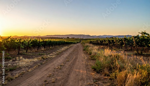 © Kitta Studio, Naklejka premium Serene Vineyard Pathway at Sunset with Lush Grapevines in View