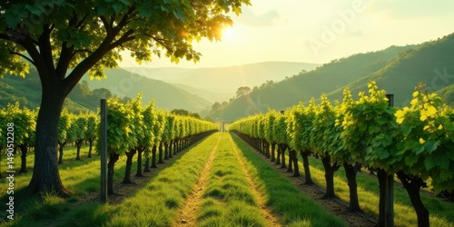 Fototapeta premium Serene Vineyard Rows at Golden Hour Lush Green Vines Basking in Sunlight, a...