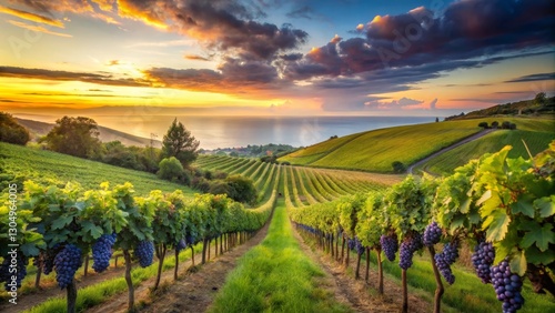 Fototapeta premium Serene Vineyard Sunset Over Coastal Hills, Rows of Grapes Ripening Under a Vibrant Sky
