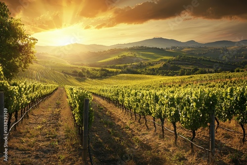 Naklejka premium Serene Vineyards Under Golden Sunset Light