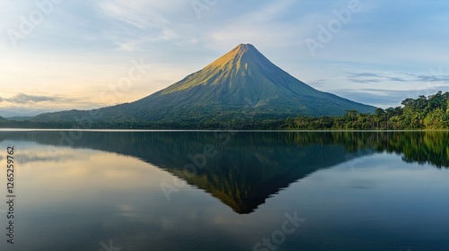 Naklejka premium Serene Volcano Reflection: A Majestic Sunrise over a Tranquil Lake in Costa Rica