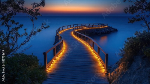 © delvin std, Fototapeta premium Serene walkway by the ocean at twilight.
