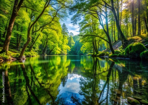 Fototapeta premium Serene Water Forest Reflections with Lush Greenery and Tranquil Waters Under...