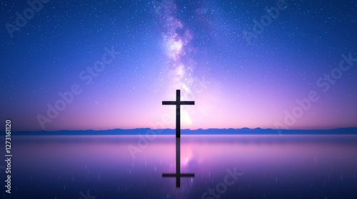 Naklejka premium Serene Water Reflection of Silhouette Cross Under Starry Night Sky Spiritual Stillness and Hopeful Faith