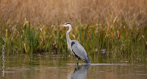 © LoFi J., Naklejka premium Serene Waterbird. A Study in Grey, Green, and Brown Against a Blurry Backdrop.