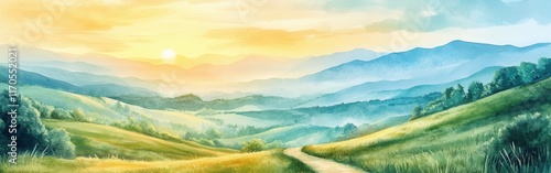 Obraz premium Serene watercolor landscape capturing a vibrant sunrise over rolling hills...