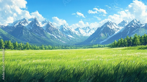 © BG_Illustrations, Fototapeta premium Serene Watercolor Landscape of Green Grasslands and Distant Hills