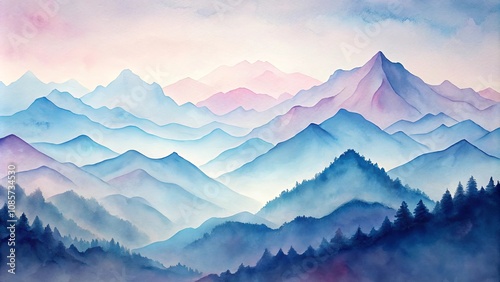 Obraz premium Serene Watercolor Landscape of Misty Mountains at Dawn