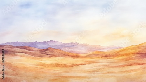 © arhendrix, Naklejka premium Serene watercolor landscape of rolling desert hills with a pastel sky, capturing the beauty of nature's vast open spaces.