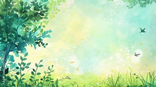 © mhekar, Obraz premium Serene Watercolor Landscape with Butterflies