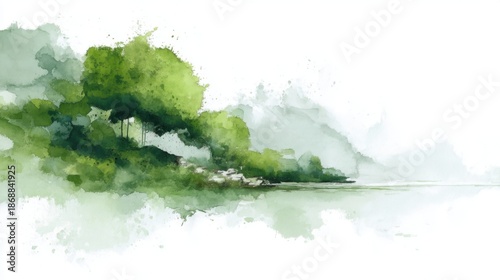 Fototapeta premium Serene watercolor landscape with lush green trees and calm lake.