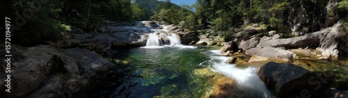 © HDR Image Creator, Naklejka premium Serene waterfall adventure nature scene hdr 360 degrees hdri view