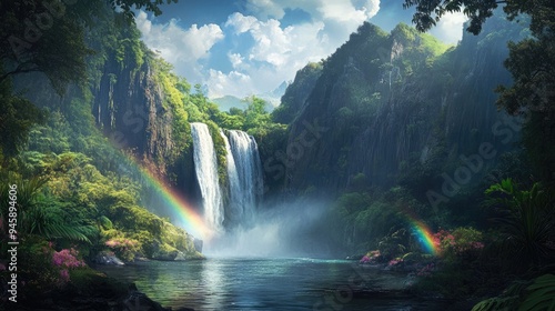 © kenza07, Fototapeta premium Serene Waterfall and Rainbow in a Lush Tropical Paradise