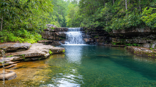 Naklejka premium Serene waterfall cascades into tranquil pool surrounded by lush greenery and...