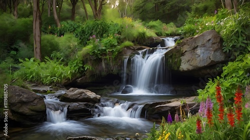 Fototapeta premium Serene Waterfall Cascades Through Lush Forest Garden