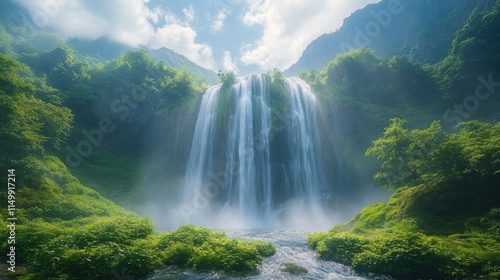 © Ali, Fototapeta premium Serene waterfall cascading down lush green mountain.