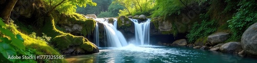 © Phetthanousack, Fototapeta premium Serene waterfall cascading down moss-covered rocks, sunlight dappling the lush green foliage A perfect representation of nature's untamed beauty and effortless flow , leaves, plants
