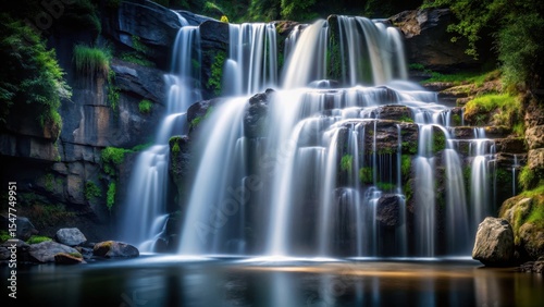 © chokdeelaw, Obraz premium serene waterfall cascading down rocky cliffs isolated on a sleek black background , scenery, wilderness