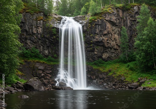 © NguyenHaiPhuong, Obraz premium Serene Waterfall Cascading Down Rocky Cliffs Soft Light. AI Generated