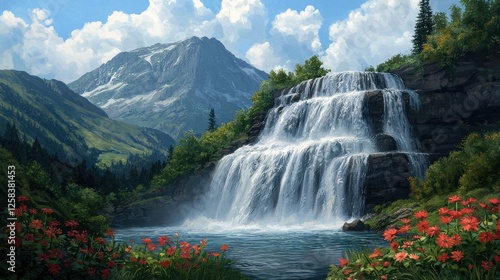 © warunthorn, Fototapeta premium Serene Waterfall Cascading Down Rocky Mountain Landscape