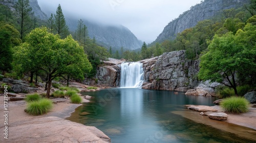 Fototapeta premium Serene Waterfall Cascading into a Blue Pool Surrounded by Lush Green Trees and Rocky Terrain Under a Misty Sky