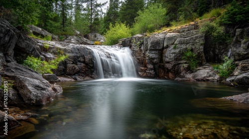 Fototapeta premium Serene waterfall cascading into a clear pool, surrounded by gray rocks and...