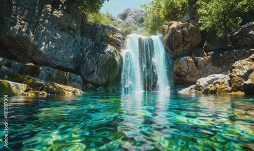 © Coosh448, Naklejka premium Serene waterfall cascading into a crystal-clear pool, 4K hyperrealistic photo.