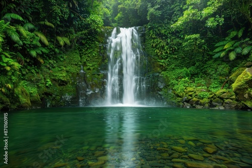 Fototapeta premium Serene waterfall cascading into a crystal-clear pool surrounded by lush,...